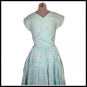 Vintage Rockabilly Dress Fit & Flare Aqua Cotton Eyelet 50s New Look VFG