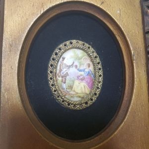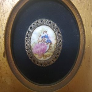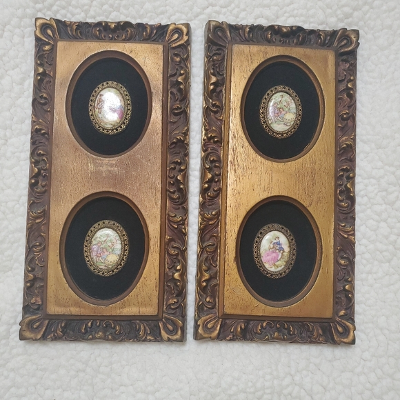 Set of two Rococo Framed Wall Hanging Picture 2 Hand Painted Porcelain Cabochons Victorian Scenes Shabby Cottage, French Provincial Hollywood. Comes from a smoke free pet free home. Each one is 11 1/2 inches × 6 inches.