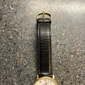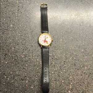 Stylish watch featuring Roger Rabbit. Gold case with a black leather strap. Perfect for fans and collectors.