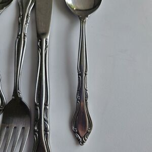 Elevate your dining experience with this vintage Rogers Auberge stainless steel flatware set. This 8-piece set includes spoons, knife, and forks, all crafted with stainless steel. The mid-century modern style adds a touch of sophistication to any table setting.Made in Korea, this flatware set is a must-have for any dining enthusiast.