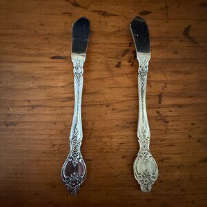 Elegant stainless steel Butter Knife Set of 2 featuring an intricate floral pattern on the handle. These classic pieces enhance dining presentation with their detailed craftsmanship and versatile design for formal and family meals.