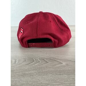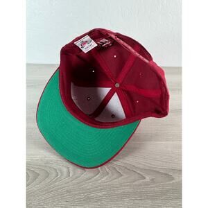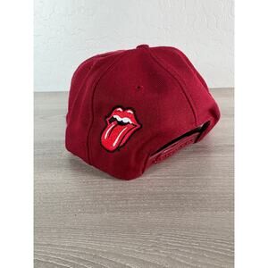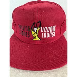 Original 1994–95 Rolling Stones Voodoo Lounge World Tour snapback hat. Features embroidered “Voodoo Lounge” design with dancing figure on front and classic Stones tongue logo on back. Deep red/burgundy crown with green underbrim. Made by Otto Cap, Made in Taiwan. Adjustable snapback closure. Excellent vintage condition. Highly collectible piece of Rolling Stones tour merchandise.