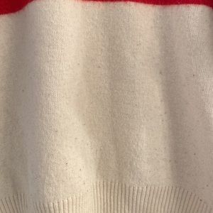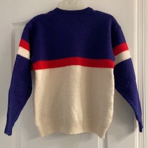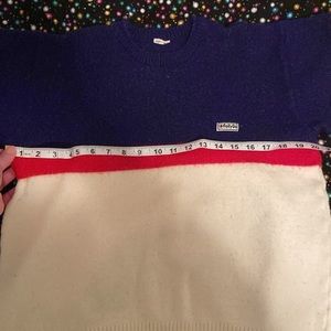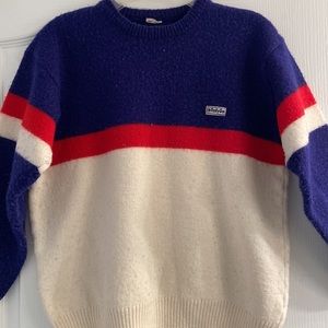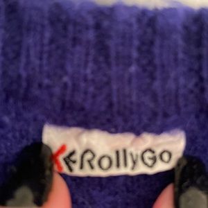 RollyGo sweater from 1970-1980s. It’s 70% wool and 30% acrylic. Sweater was once larger and was washed. It’s now roughly a size small. Sweater is very thick and compact fabric.