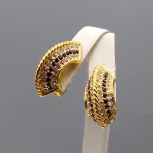 Vintage Roman Crystal Hoop Earrings, Black and White Pave over Gold Tone Clip Ons