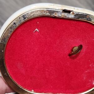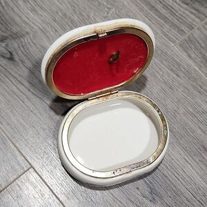 Vintage Romanee Creative Collection Fliral Heart Porcelain Oval Music Jewelry Box, hardware shows patina and inside red velvet lining on lid has one small spot that's been pushed, see pictures. Music is by Tagiri. Cute and fun girly piece.