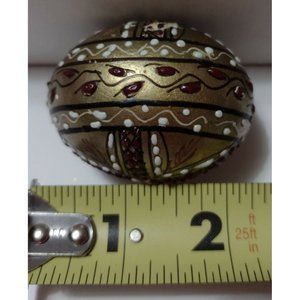 Vintage Romanian Pysanky Hand Painted Real Easter Egg red, white, black and gold colored in across pattern with scroll edging.