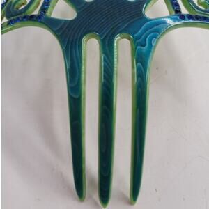 Antique Green Celluloid Blue Rhinestone Art Nouveau Hair Comb Vintage Glam Piece