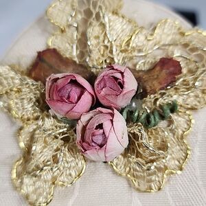 Sweet romantic vintage Miniature roses atop a damask covered oval box. Inside you will find a damask covered picture frame with scalloped piped edges. The frame has a plastic window insert.