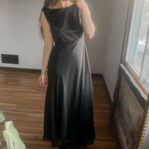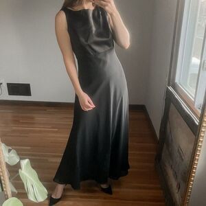 Vintage long length dress in Black. Features a very romantic silhouette with elegantly draped fabric in the back, decorative satin bodice, & high jewel neckline to make your shoulders delicate. Vintage size 11/12, fits like a size 4 or 6. In good condition. No holes, rips, or stains. Ours is a smoke free home.