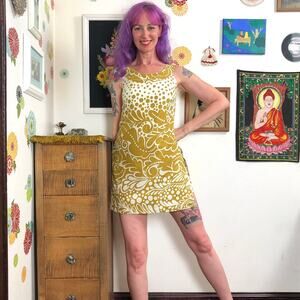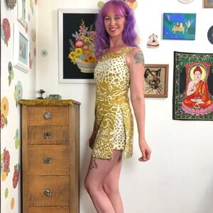 Looks like a sleeveless micro mini dress, but the front and back flaps lift to reveal gold polka-dot shorts beneath! SO CUTE! Look super put-together and fashionable, while still being crazy comfortable. This is the perfect outfit for backyard cookouts, picnics, a day at the park, brunch, a trip to the beach - all your summer casual activities! Has a zipper up the back and is fully lined.