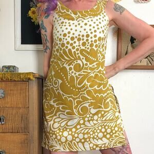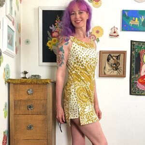 Vintage Skirted Romper, 1960s Gold and Cream Abstract Floral Romper with Skirt, Size Small