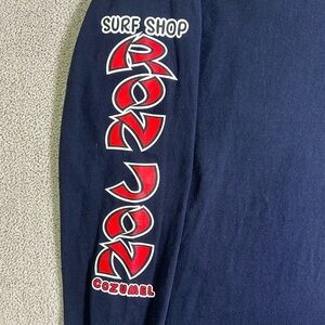 Navy sweatshirt featuring Ron Jon Cozumel logo. Bold red and white designs on sleeve.