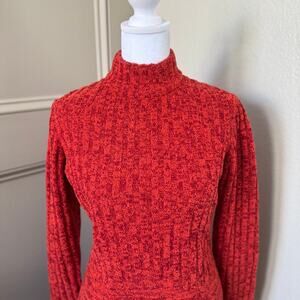 This vintage Roncelli sweater dress packs a punch of color . Tailored in a wool boucle' that is twisted with a reddish orange and dark red fibers. The silhouette is fitted with long sleeves and a mock neck. The bodice and sleeves are ribbed. There is a small chevron in the rib at the center front and back waist. The skirt has a flippy a-line. Unlined. Zips up the back.