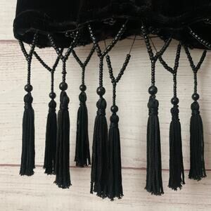 Vintage Ronni Nicole black velvet maxi straight skirt with beaded and string tassels at the bottom. The tassels have a beaded Y that end at a larger bead, from which a string tassel hangs. There is a back slit in the middle back of the skirt. The skirt is vintage with tags. The tag has a store proof of purchase sticker on one side and a peeled-off sticker on the other. Some of the beaded tassels are stretched, exposing the string that they are strung on and causing them to hang lower than the other tassels, slightly. At the waistband, the velvet is smushed in 3 spots (one on front and two on back), most likely from a hanger. These spots are 1/2"-7/8" long. (see close up photo)