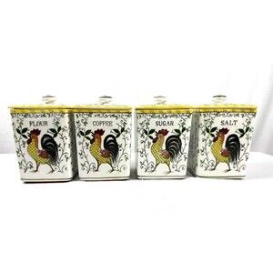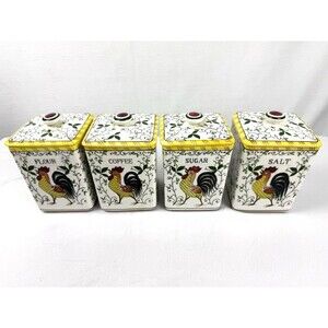 This vintage "Rooster and Roses" Kitchen Set of 4 Canisters from Early Provincial Japan features a charming farmhouse style with a multicolor pottery design that includes rooster motifs. The small canisters have a flat lid and a single compartment, each measuring 4 1/2" in length and 7" in height. The set includes the original Ucagco brand canisters with a beautiful rooster and rose theme, perfect for adding a touch of nostalgia to your kitchen storage and organization needs.