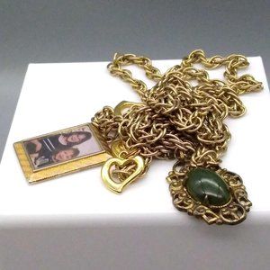 Vintage Rope Chain Charm Necklace, Long Gold Tone with 5 Charms, 3 Hearts, Stone Cabochon and Photo Pendant