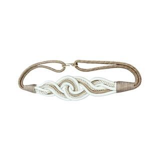 Vintage rope belt featuring an intricate nautical knot design in a classic tan and ivory color palette. This statement piece adds texture and interest while still feeling neutral and timeless. A great vintage accessory for cinching dresses, styling over knits, or adding a coastal-inspired touch to everyday looks.