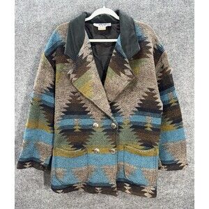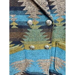 Vintage Roper Rodeo Blue Aztec Jacket Medium Silver Buttons Barn Chore Coat. USA made. Could be a unisex item based on size. Fits a mens medium or womens medium relaxed fit. All measurements in photos. Overall in great shape- only flaw found is a tear in the liner - can not see from the outside of coat. Coat feels like a blanket flannel/wool/acrylic type blend. Very warm. Fast shipping!