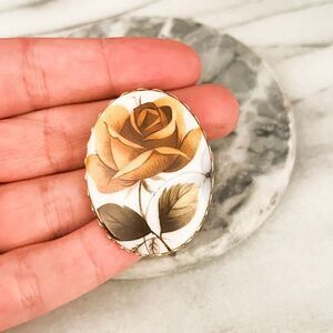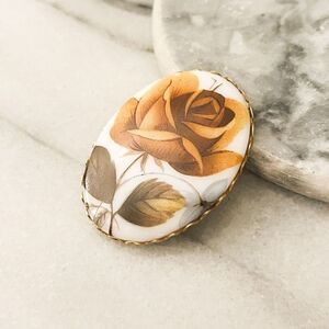 Vintage Rose Brooch Pin Transfer Design Brown Gold Toned Metal Cabochon Regency