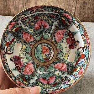 Small soup or rice bowl (about 4.5" across and 2" tall) with matching spoon (about 5.5" end to end) in a very detailed rose medallion pattern. Use for food, of course, but also just a lovely bowl for display. Likely dates to the 1960s or 1970s.