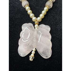 Vintage Rose Quartz Butterfly And Ivory Pearls Necklace
