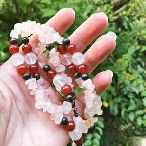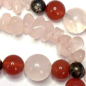 Features: Rose quartz chips and rounds; carnelian round beads; oxidized metal spacer beads; sterling silver spring-ring clasp
