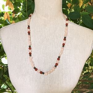 Soft rose quartz and carnelian beads bring a natural harmony, accented by dark metal spacers for contrast in a versatile strand.