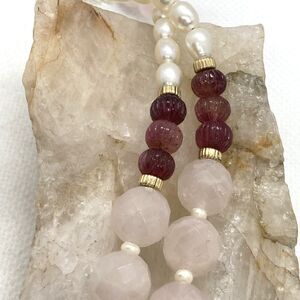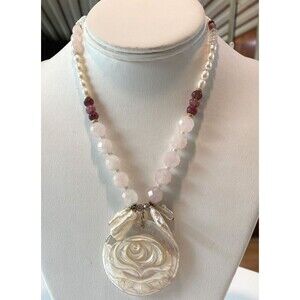 Stone Type: Carved mother of pearl pendant, rose quartz, tourmaline and pearl beads.