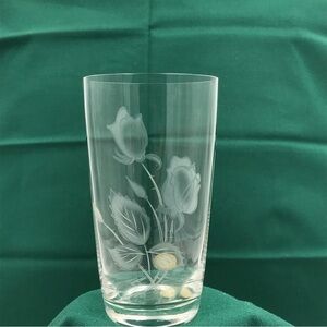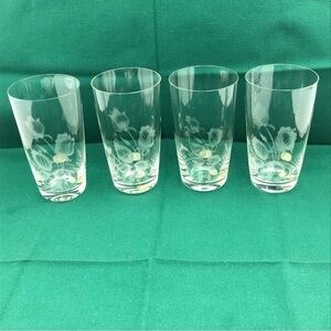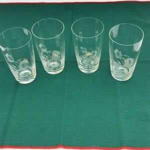 Set of four Rosenthal glasses. The have an etched cut glass flower or rose design. They measure approximately 4.75 inches tall and 2.5 inches in diameter. Great condition! Very thin dainty glass.