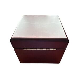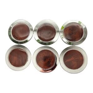 Very good preowned condition. This is a beautifully made Rosewood box with a silver tone hinge, and a nice silver closing clasp in front. Inside the velvet lined box are six.  3 1/2 inch in diameter, silver tone coasters with felt bottoms. each coaster is Silver toned with a 2 1/2 inch center of laminated wood. While these have been worn in certain areas, please refer to photos they are certainly a beautiful addition to your home bar or kitchen. The box itself measures approximately four and 3/4” square.
