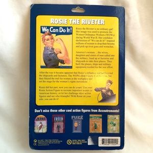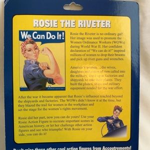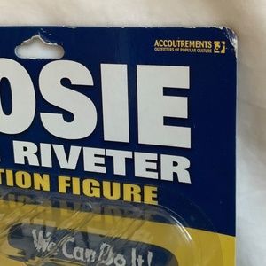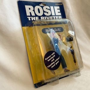 Rosie the Riveter Action Figure, based on the famous "We Can Do It" poster from WWII. Un-opened Package with a little shelf wear to the edges. Also a little compression/denting on the sides of the plastic, which is typical of this style of packaging.