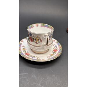The product is a vintage Queen's Rosina China "Flower of Amaran" bone china dimitasse cup and saucer set, made in in England by ROSINA China company LTD