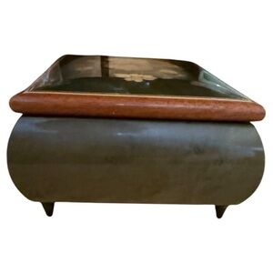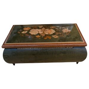 Beautiful Emerald Green colored Italian Inlaid jewelry box with an intricate floral design in the lid. Mechanism in excellent working condition!