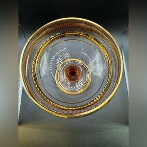 Lovely compote. Approx 5.75” tall and 5” across. It does have some scratching around the gold rings, but rings are still thick. No major problems, chips, or cracks.