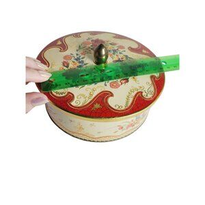 This 1960's vintage round biscuit tin, adorned with an embossed floral pattern, evokes a sense of nostalgia. Its elegant design showcases intricate floral motifs with a rich color palette, adding charm to any space. Crafted in England, it serves as a decorative storage piece with historical appeal.