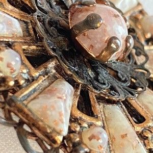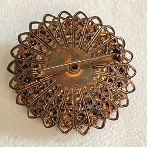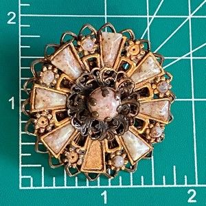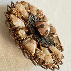 Vintage Round Brooch Copper Glitter Marbled White Stones Pinwheel Design