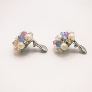 Add a pop of color to your vintage jewelry collection with these stunning round cluster clip on earrings, often referred to as "fruit salad" style for their vibrant mix of colors. These 1-inch earrings feature a beautiful combination of faux pearls and faceted beads in pink, blue, and green, creating a dazzling and playful look.