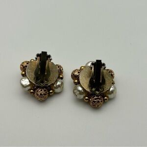 Vintage Round Faux Pearl and Gold Tone Textured Beaded Clip On Earrings