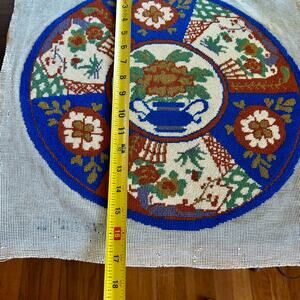 Gorgeous vintage hand-stitched needlepoint artwork, unframed, featuring an ornate circular floral motif. The central design showcases a classic urn overflowing with red and green flowers, surrounded by alternating fan and floral panels in rich shades of cobalt blue, rust, olive green, and ivory. The vibrant color palette and intricate stitching evoke a timeless European-inspired style reminiscent of antique tapestry work.