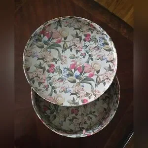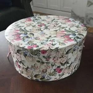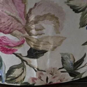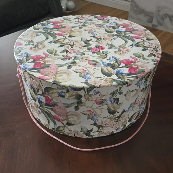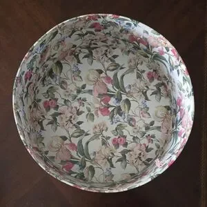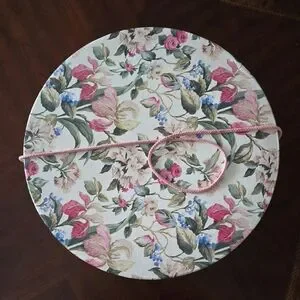 Large, cardboard with pink cord. Cream color background with pinks, greens, blues and cream colors. Same pattern on inside.