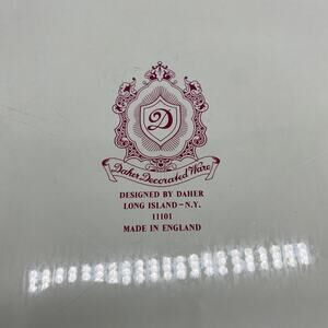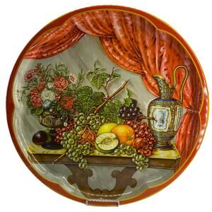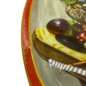 Vintage Round Metal Tray by DAHER DECORATED WARE, Made in England. Fruit, Flowers, and Ewer on wood table still life scene. Some minor paint loss in a couple areas on front rim. Overall, nice condition. Please see photos for condition detail.