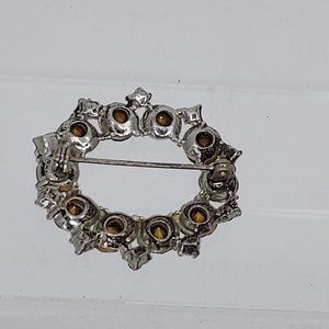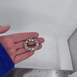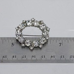 1" round foil back rhinestone brooch. Good condition some normal wear on metal backing. clasp and closure work well and all stone clear and secure.