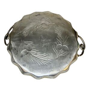 Vintage Round Scalloped Aluminum Serving Tray W Gorgeous Pine Cone Limb Motif