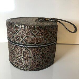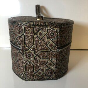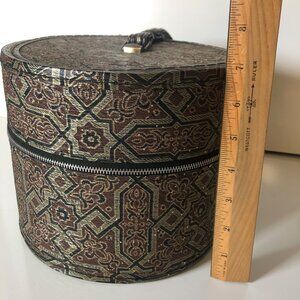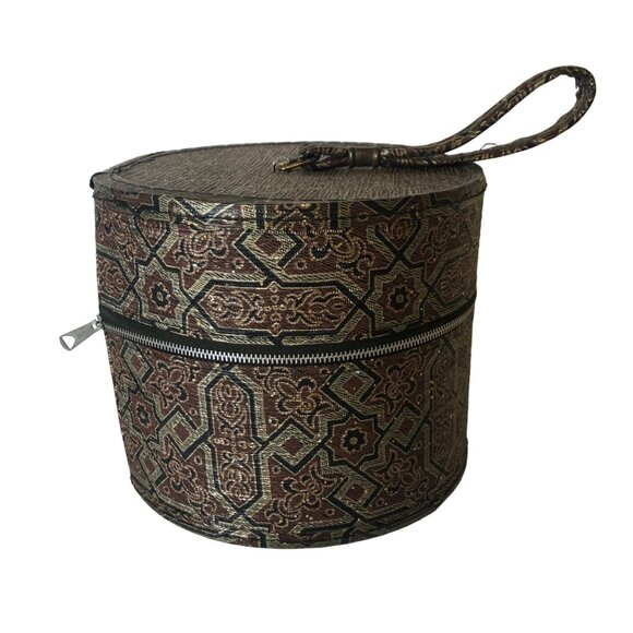 This vintage vinyl storage box features a detailed tapestry design and a practical zipper closure. It's ideal for storing wigs, small hats or carrying accessories on a trip, providing both style and functionality. The sturdy handle ensures easy transport.