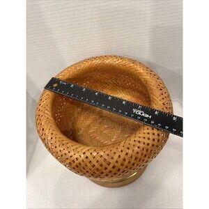 Double walled vintage basket and wonderful condition. The design immediately catches your eye and invites you to touch it with your hands. It is a very tactile piece, and lovely. I see one spot where theres a little gap. Please see photos for details. The opening diameter is about six and three-quarter inches. It is about 5 1/2 inches tall and the overallwidth is about 9 1/2 inches.
