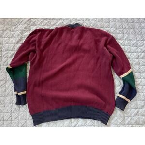 Vintage Roundtree & York Hand Intarsia Men's Large Preppy Golf Color Block Knit Sweater with Large Insignia that reads Golf Tradition Excellence. 100% Cotton Vertical Stripes of Maroon, Navy Blue, Green and Cream Colors. 24" pit to pit, 26.5" shoulder to waist. Smoke free pet free home.