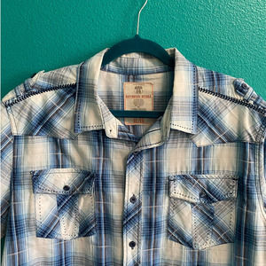 This white and blue plaid short sleeve button down shirt is made by Route 66. This shirt features blue buttons down the front and two front pockets with blue pearl snaps. Contrasting blue knit stitching details. In good condition with some slight fading due to age, see photos. Relaxed fit. 55% cotton, 45% polyester. Made in China. Men's size XL.