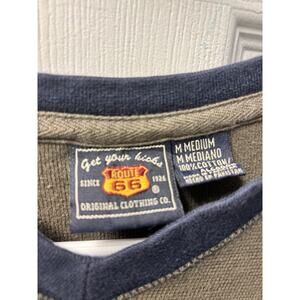 This Vintage Route 66 Olive Green and Navy Pullover in size M is a stylish and classic sweatshirt for men. Made with quality materials, this pullover features a comfortable regular fit and a timeless pullover style. The olive green color adds a touch of retro flair to any outfit, making it a versatile and cozy addition to any wardrobe. Perfect for casual wear or as a statement piece for a nostalgic look, this vintage sweatshirt is sure to become a staple in any man's clothing collection.