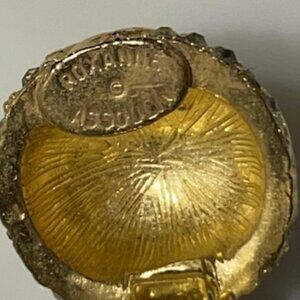 These vintage yellow gold tone metal clip on earrings are adorned with clear round crystal glass rhinestones, a drop honey amber glass ornament, finished on the bottom with another amber/gold tone disc. Signed Roxanne Assoulin. Costume Jewelry. Stamped on Back.