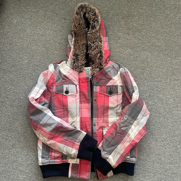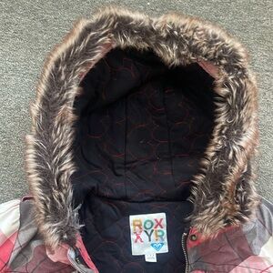 Vintage Roxy Jacket with minor flaws, sold as is. Stains shown in pictures. Fur on hood in exc condition